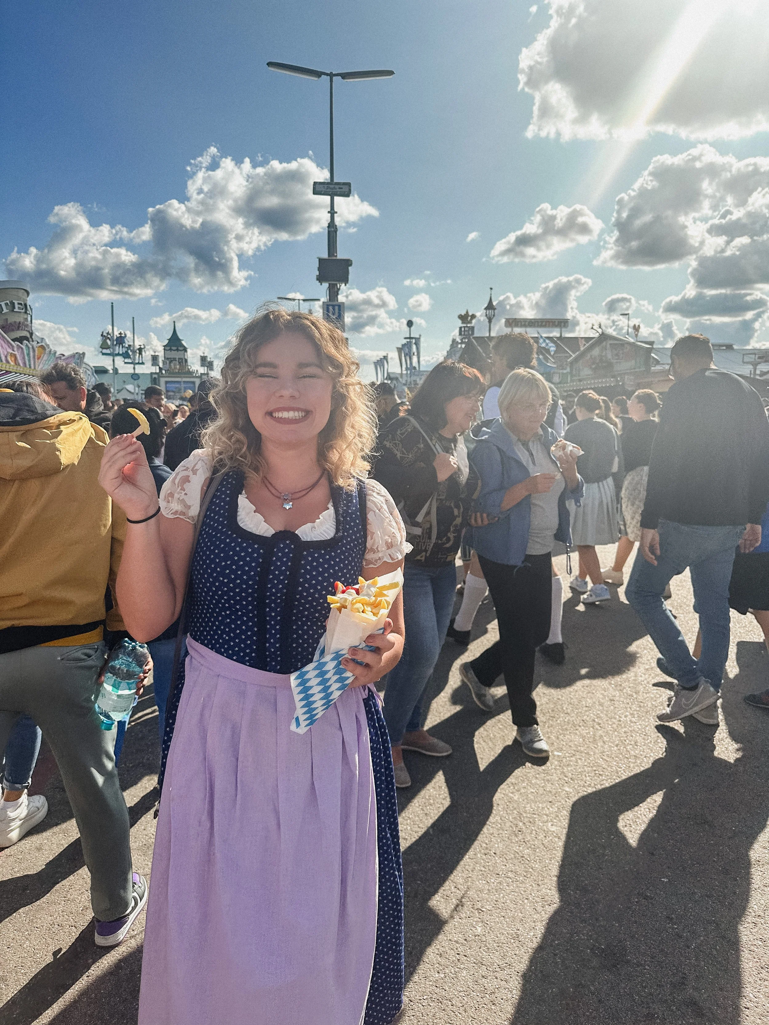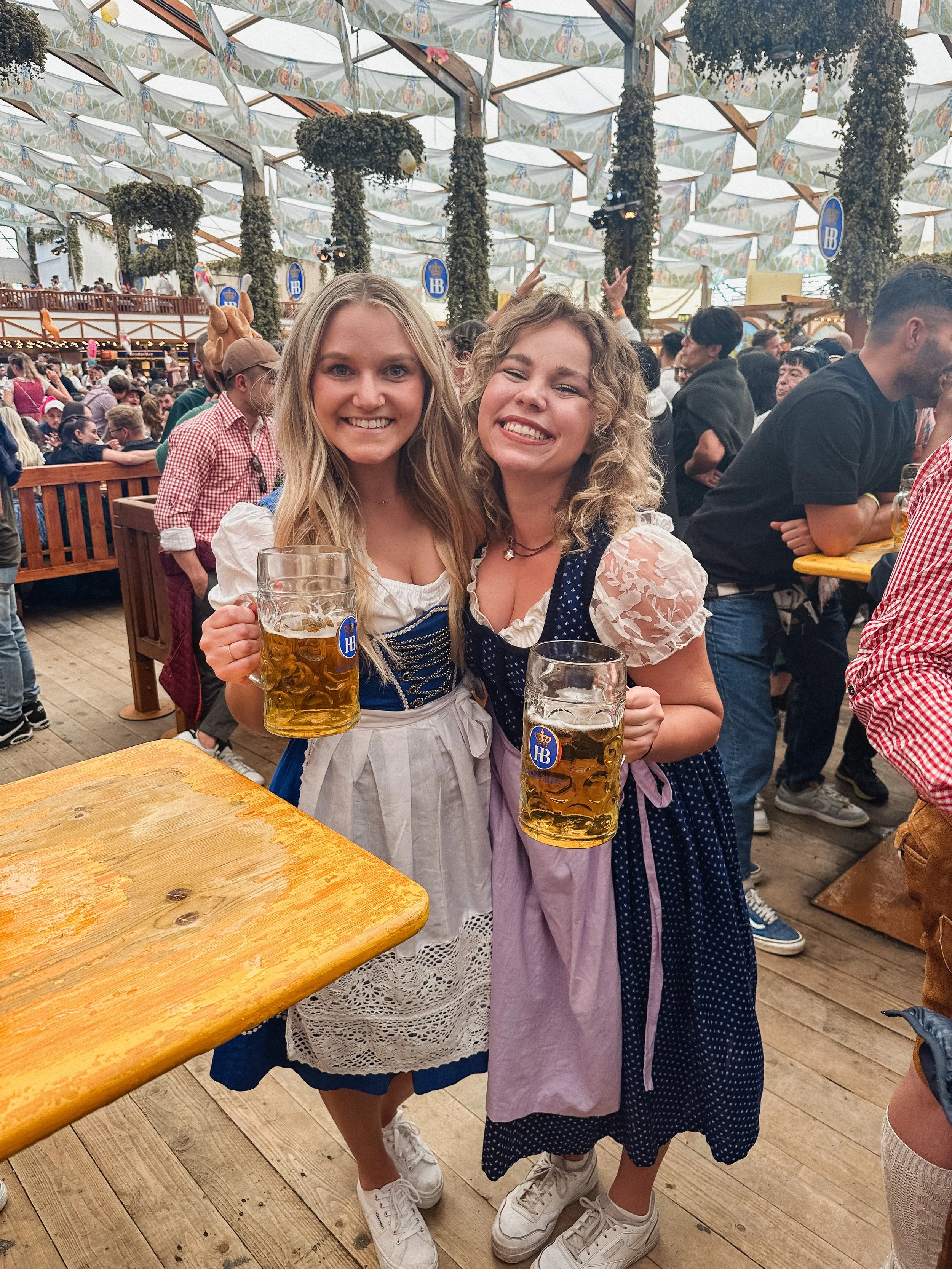 You can tell right away which is a costume vs a traditional dirndl. The rule of thumb is the dress is supposed to be below the knees. I was living in San Francisco at the time and found a decades-old vintage shop called held over, that sold used dirndls so I bought two of them for around 150 usd. I recommend buying one used to save on the cost since they can be pretty pricey. You can buy or rent one when you are there, however it is somewhat stressful to shop around the day before. They are also way more expensive near the festival so to ensure you are all set I would buy one before and pack it with you!